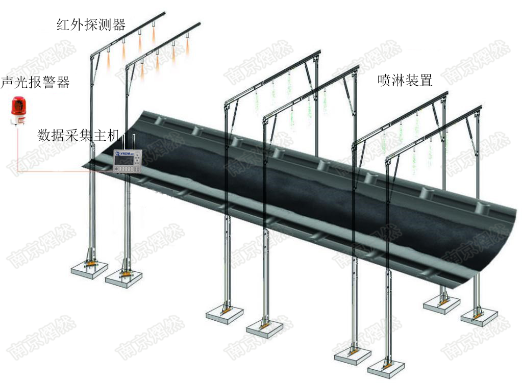 皮帶明火煤監(jiān)測(cè)系統(tǒng)主要采用紅外探測(cè)器探測(cè)輸煤皮帶上的物料溫度,當(dāng)皮帶上物料溫度超過系統(tǒng)報(bào)警溫度時(shí),由明火煤監(jiān)測(cè)系統(tǒng)控制器發(fā)指令控制噴淋電磁閥動(dòng)作,由噴淋頭噴出消防水,實(shí)現(xiàn)滅火降溫的目的。當(dāng)監(jiān)測(cè)溫度達(dá)到預(yù)設(shè)的溫度閥值時(shí)通過熠然智能監(jiān)測(cè)系統(tǒng)軟件發(fā)出報(bào)警信息,最終達(dá)到消除煤炭自燃產(chǎn)生的安全隱患